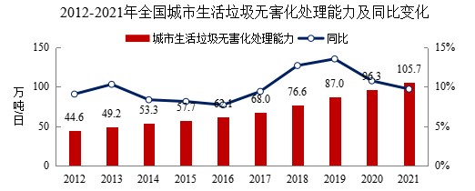《公报》指出,2021年,全国城市生活垃圾无害化处理量2.5亿吨,同比增长5.9%;生活垃圾无害化处理率99.88%,比上年增加0.14个百分点;生活垃圾无害化处理能力105.7万吨/日,同比增长9.7%,其中,焚烧处理能力占比为68.1%。