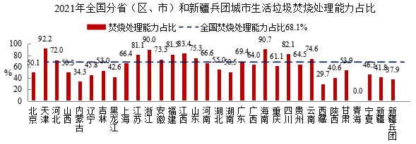 天津、海南、浙江、江西、四川、福建、江苏、山东、云南、安徽、河北、广东、河南、上海、贵州、广西和重庆17个省(区、市)城市生活垃圾焚烧处理能力占比超过60%;湖北、甘肃、吉林、湖南、山西、北京、宁夏、辽宁、黑龙江、新疆和陕西11个省(区、市)在40%-60%之间;内蒙古、西藏、青海3个省(区)和新疆兵团不足40%。