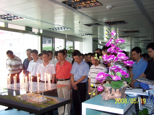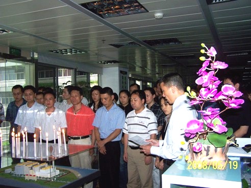 为了表达绿色动力领导和员工对地震遇难同胞的深切哀悼,5月19日下午2点28分,在集团公司执行董事黄建中致哀悼词后,集团公司全体领导和员工在集团公司办公室面向点燃的“心形”蜡烛为灾区死难同胞肃立默哀三分钟。